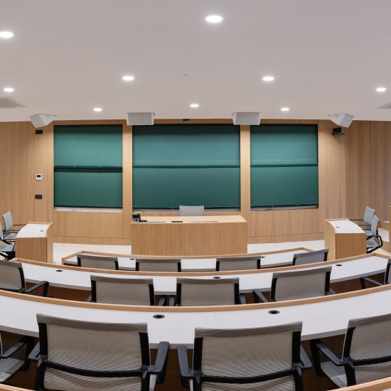 El aula principal está diseñada según el propósito del IESE de fomentar la participación activa del alumnado. El espacio se articula en torno a las pizarras centrales y la posición del profesor. Tanto el mobiliario diseñado como los techos se configuran en semicírculo siguiendo esta lógica, creando un ambiente óptimo para la enseñanza.