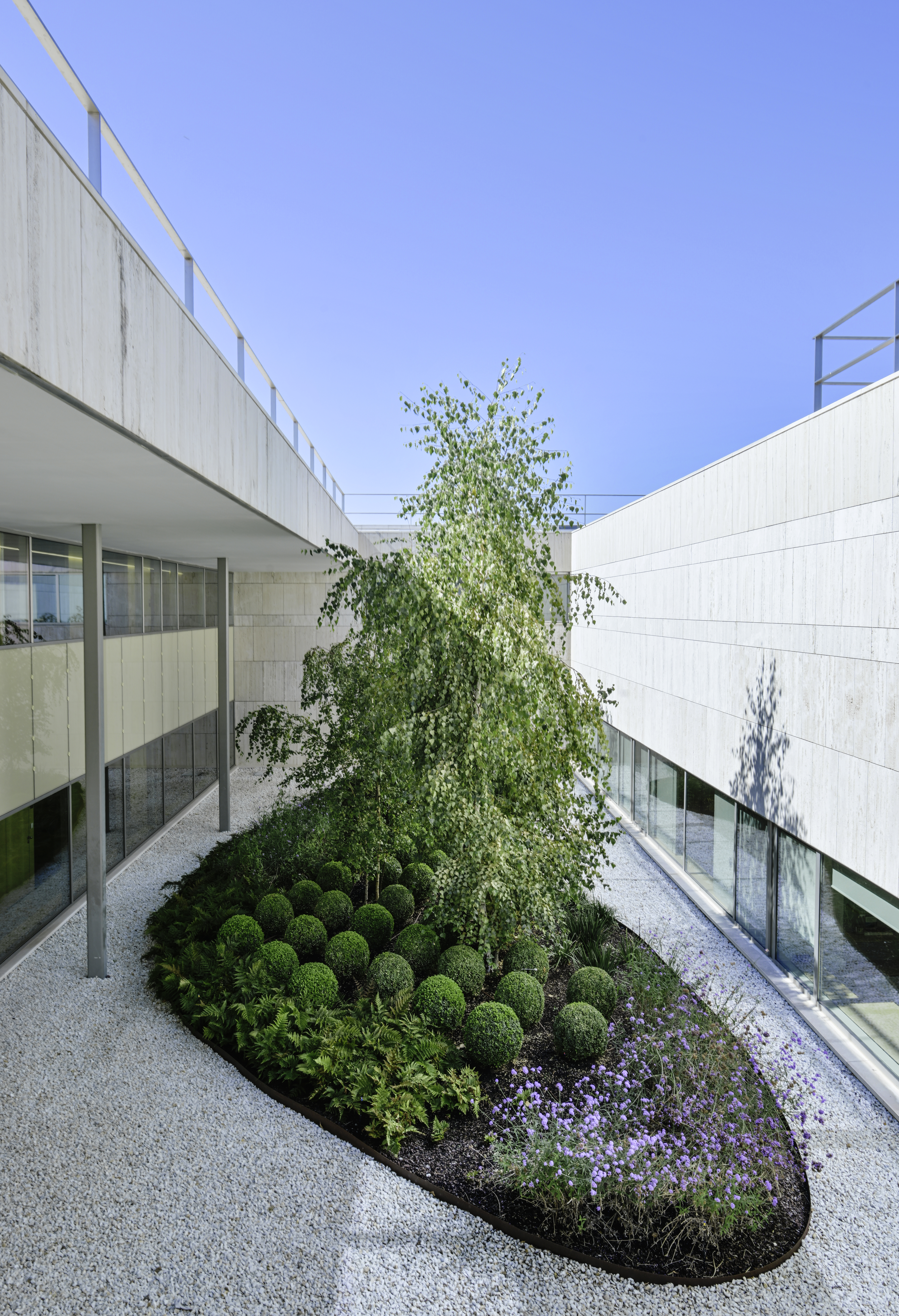 En cuanto al ajardinamiento, se pretende una mayor integración del campus en el pinar en el que se encuentra; se conservan ejemplares y se incorporan nuevos pinos, complementados con otras especies vegetales que se van diversificando a medida que se avanza en la parcela, creando una transición natural entre arquitectura y paisaje.